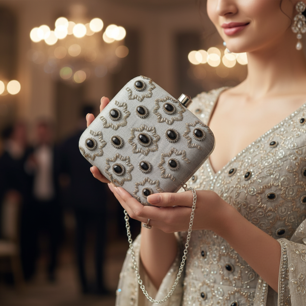 This Grey Square Shape Hand Clutch is made with premium material by skilled artisans who have years of experience in the handicrafts. This Grey Hand Clutch is crafted using finest quality silk wrapped over a quality metallic frame and embellished with the black onyx gemstones for a fancy look. The interior is spacious enough to hold your daytime essentials and it is made with satin fabric. It comes with a detachable carry chain for your convenience and a jeweled clutch knob.